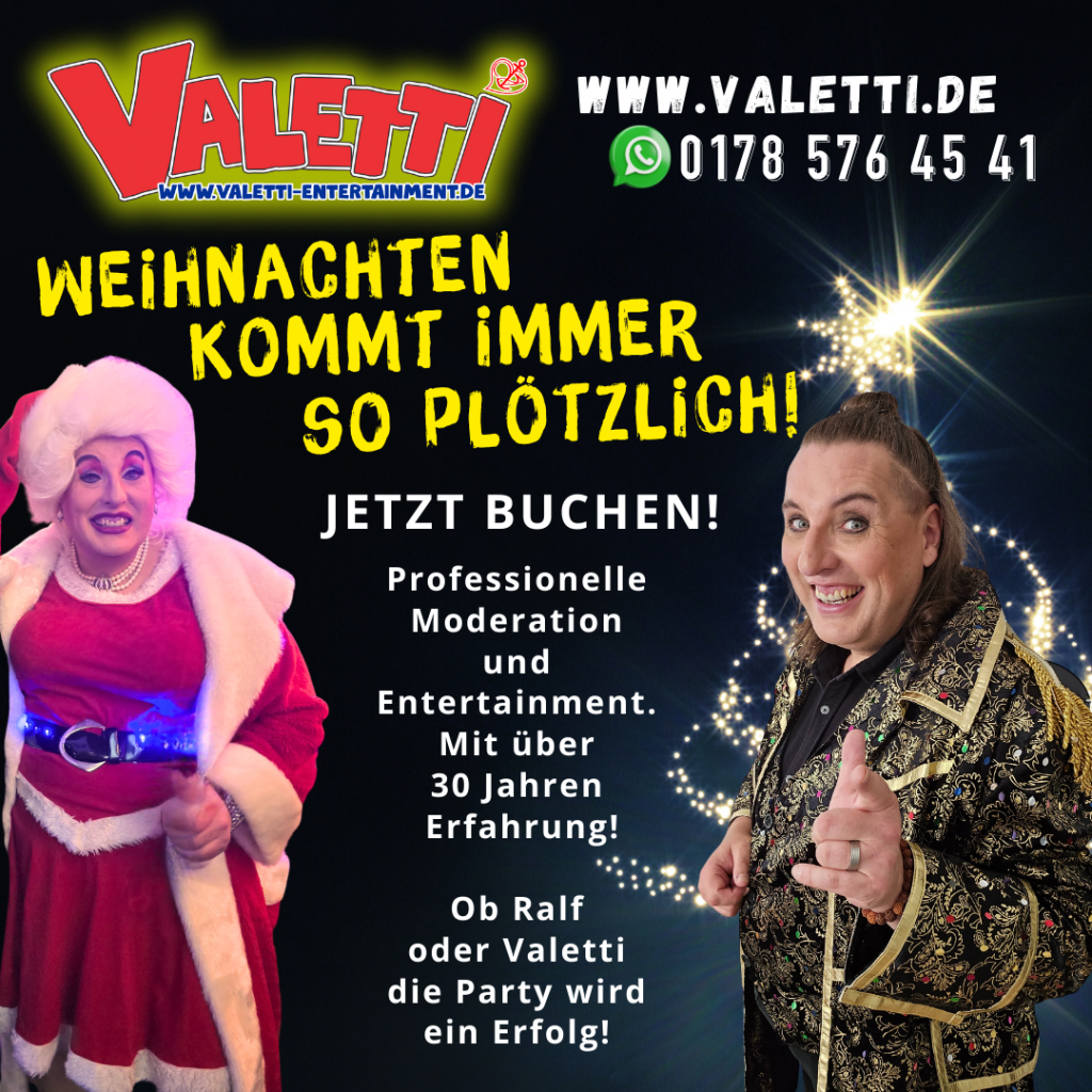 Valetti, die schillernde Bühnenfigur mit über 35 Jahren Erfahrung, bringt mehr als nur Glamour und Glitzer: Sie bringt Menschen zusammen. Mit improvisierten Momenten, herzlichen Einblicken und blitzschneller Schlagfertigkeit lädt sie das Publikum ein, selbst Teil der Show zu werden. Denn hier dürfen auch Ihre Gäste ihre eigenen Geschichten erzählen – charmant und humorvoll begleitet von der schlagfertigen Valetti.