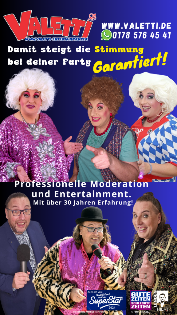 Valetti Entertainment steht für glamouröse Travestie, Humor, Musik und Entertainment auf höchstem Niveau. Ralf Ottmers alias Valetti begeistert seit über drei Jahrzehnten auf Deutschlands Bühnen, in TV-Shows, Radiosendungen und bei großen Events. Bekannt aus RTL, SAT.1, VOX, Kabel1 und Pro7 – die höchste im Norden bringt Glanz, Stil und herzliche Comedy in jeden Auftritt.